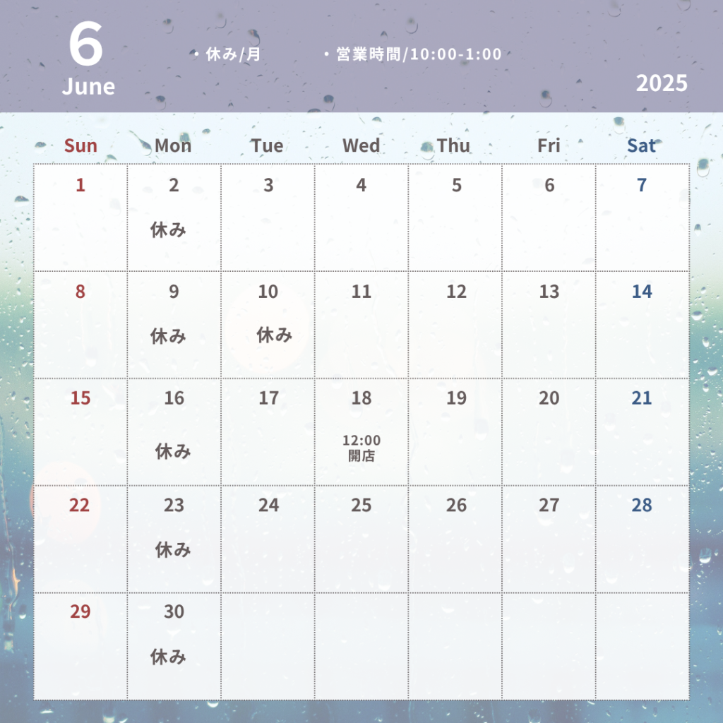 6/10(火)は臨時休業、6/18(水)は12:00からの営業になります。